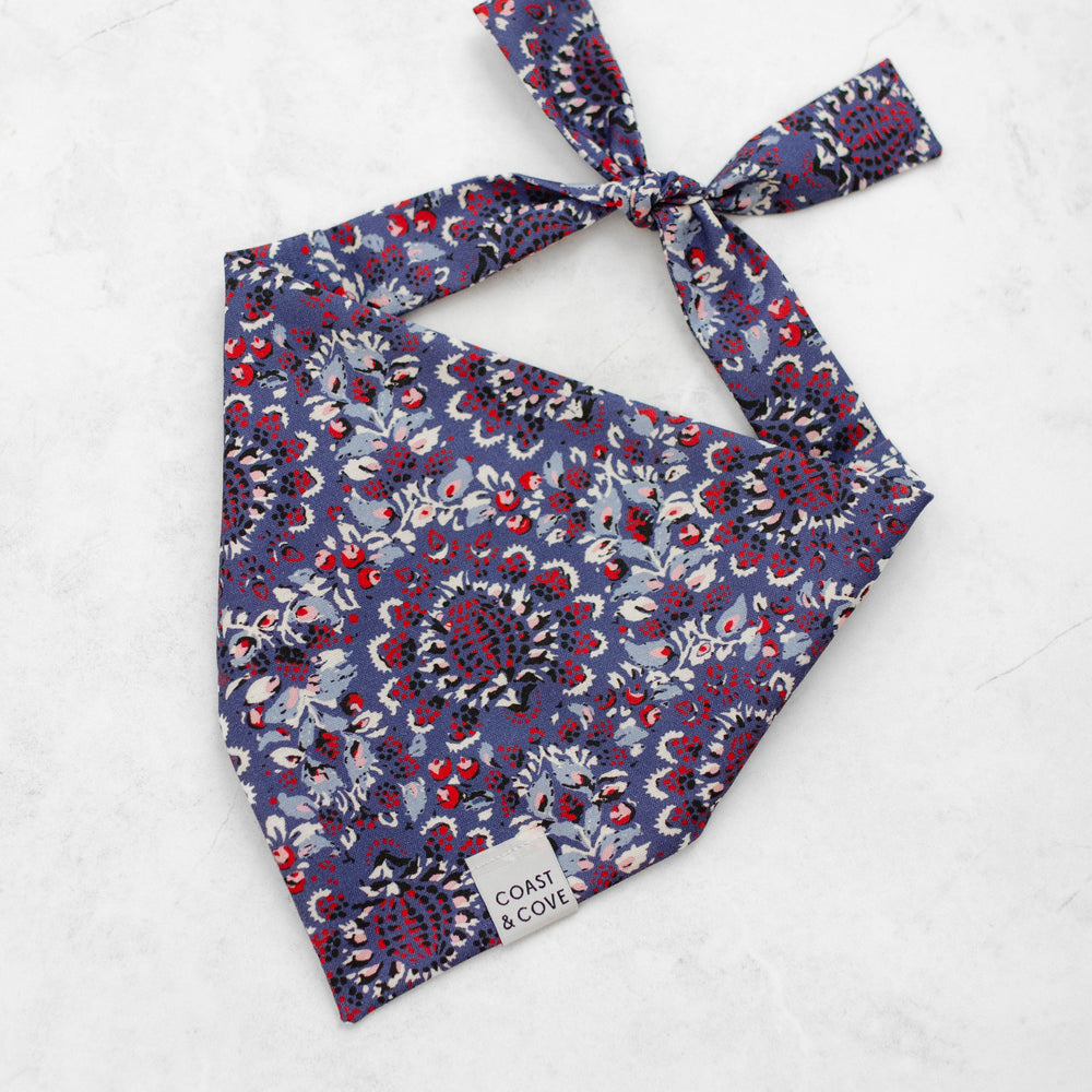 All of our pet bandanas are hand-crafted in California. They feature a triangle shape with matching ties and are designed to be worn tied on in a double knot so you can easily adjust the sizing to fit your pet! All of our bandanas will come finished with a Coast & Cove tag. Please refer to our size chart for length based on your pets neck. If your pet is between sizes we recommend sizing up.