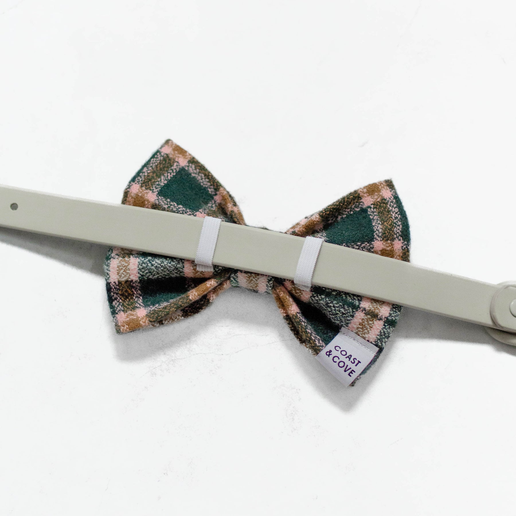 All of our pet bow ties are hand-crafted in California and feature two elastic straps on the back to easily slide onto your pup’s collar.