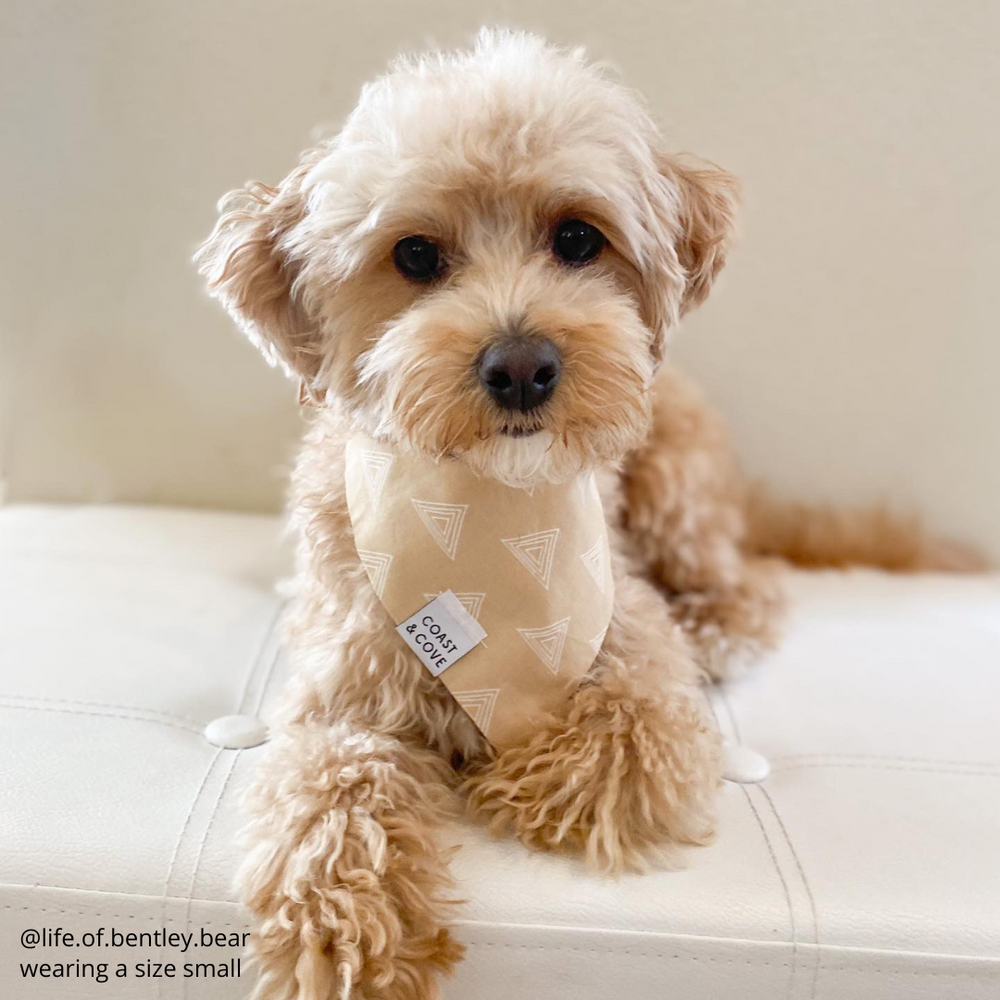 All of our pet bandanas are hand-crafted in California. They feature a triangle shape with matching ties and are designed to be worn tied on in a double knot so you can easily adjust the sizing to fit your pet! All of our bandanas will come finished with a Coast & Cove tag. Please refer to our size chart for length based on your pets neck. If your pet is between sizes we recommend sizing up.