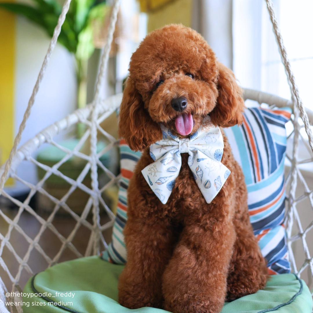 All of our pet sailor bows are hand-crafted in California and feature two elastic straps on the back to easily slide onto your pup’s collar.